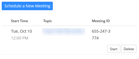 The 'My meetings" tab allows you schedule a new meeting, and presents the user with a list of currently scheduled meetings.
